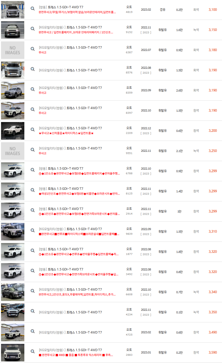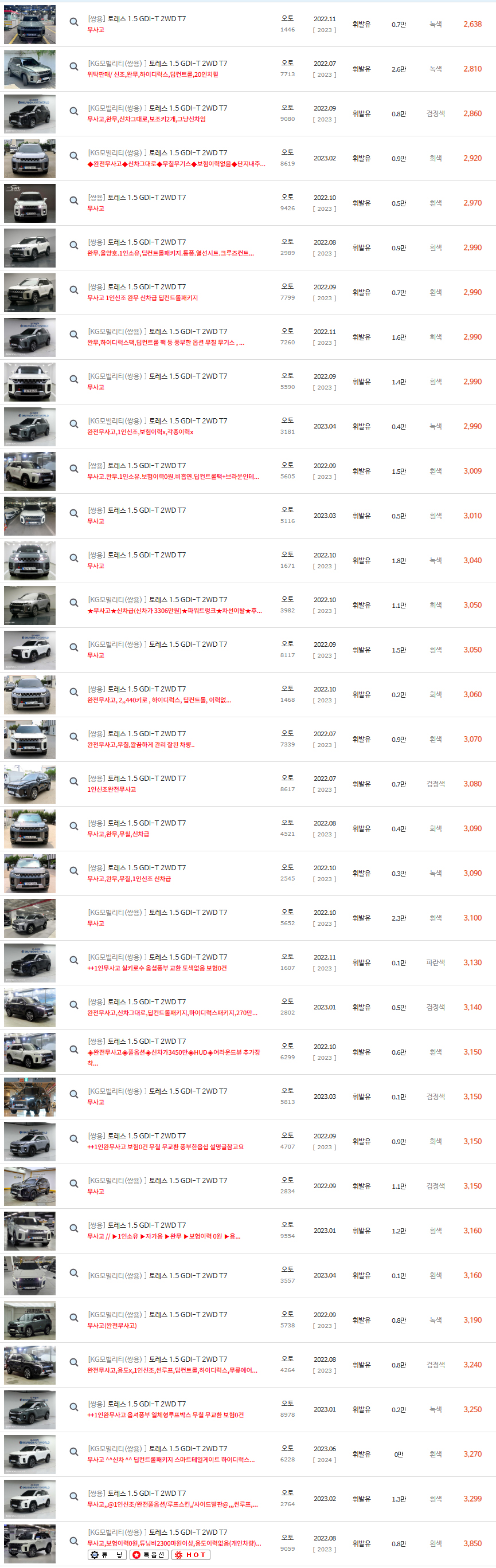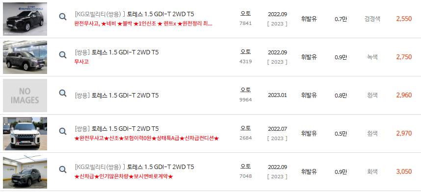 위에서 중고차매매사이트에서 딜러가 판매하고 있는 토레스중고차의 리스트를 살펴보았습니다.