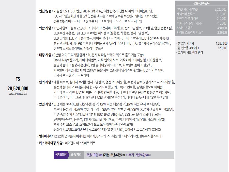 토레스의 가장 기본 트림은 T5 가 되겠습니다.