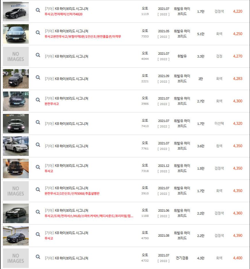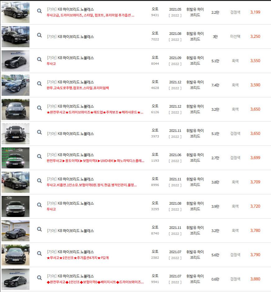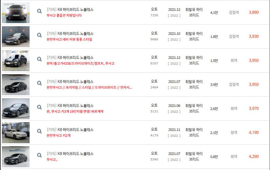 그럼 현재 믿을 수 있는 딜러들이 공유하는 중고차매매사이트에서 판매되고 있는 K8 하이브리드의 2021년식 중고차가격시세표를 확인 해 보도록 하겠습니다.