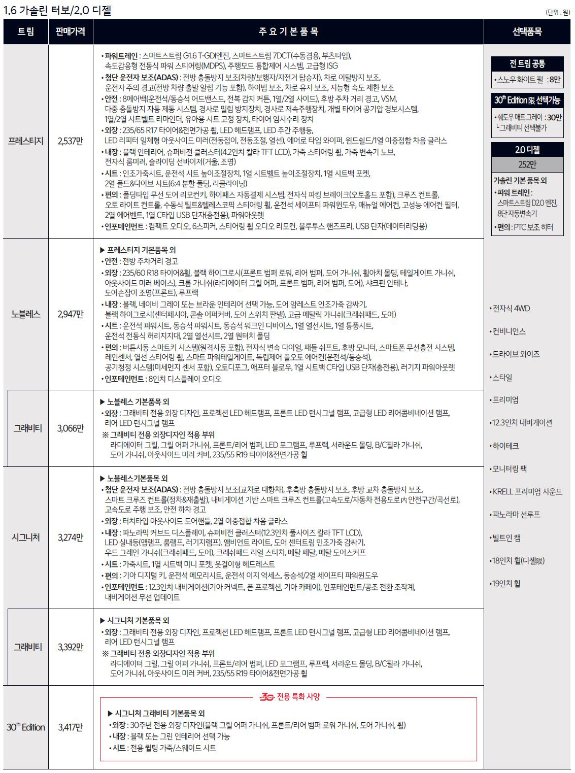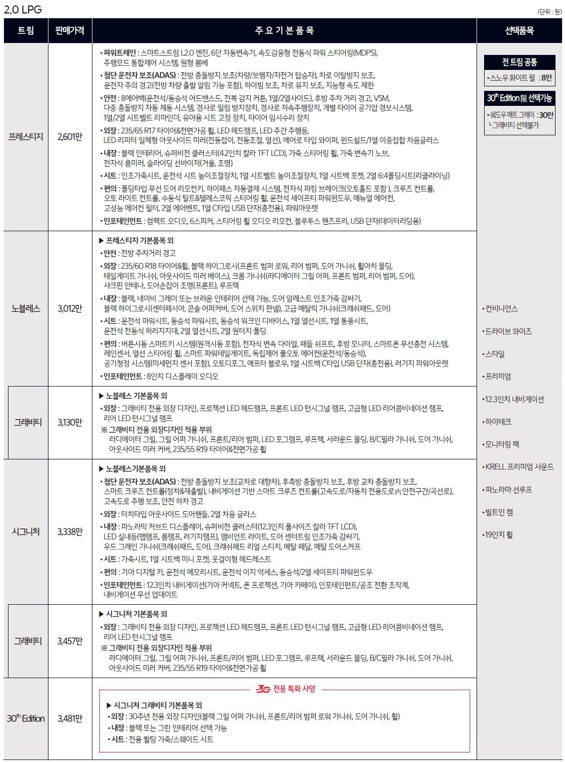1.6 가솔린 터보를 기준으로 프레스티지 2537 만원, 노블레스 2947만원, 노블레스 그래비티 3066만원, 시그니처 3274만원, 시그니처 그래비티 3392만원, 30년에디션 3417만원에 판매가 되고 있습니다.