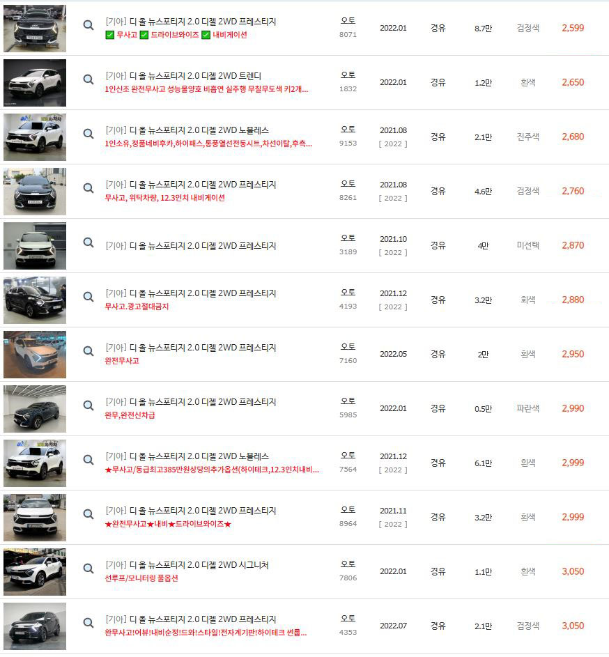 | 스포티지 2.0 디젤 중고차 | 2,600 만원 ~ 3,500 만원 |