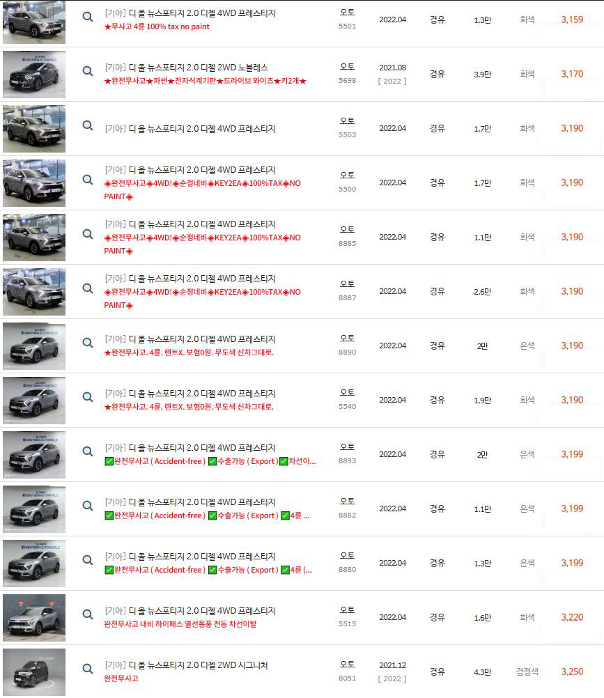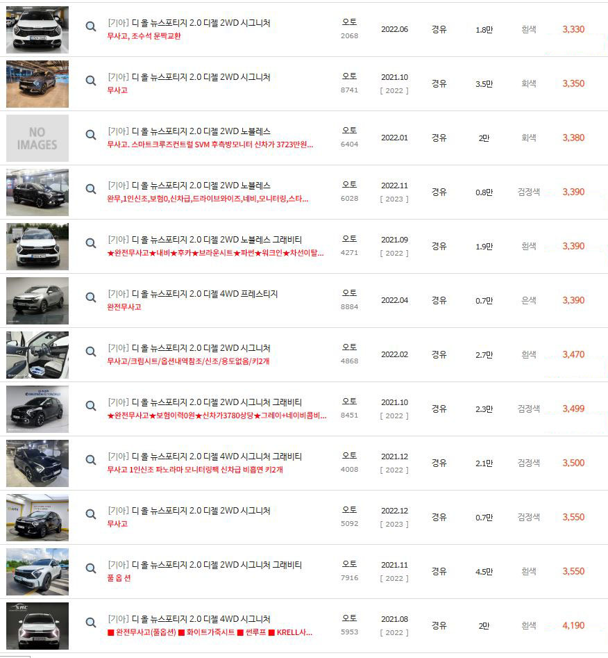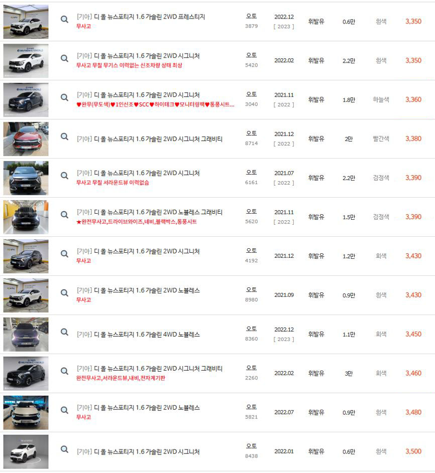 그럼 현재 중고차매매사이트에서 판매되고 있는 디올뉴 스포티지의 중고차시세표를 알아보도록 하겠습니다.