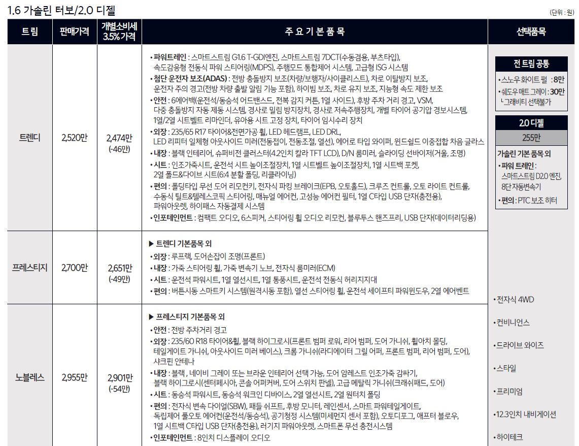 가솔린 차량과 디젤 차량의 등급별 옵션들은 동일하며 디젤 엔진을 선택하게 되면 252만원의 비용이 추가되며 8단 자동변속기와 PTC 보조히터가 추가된다고 합니다.