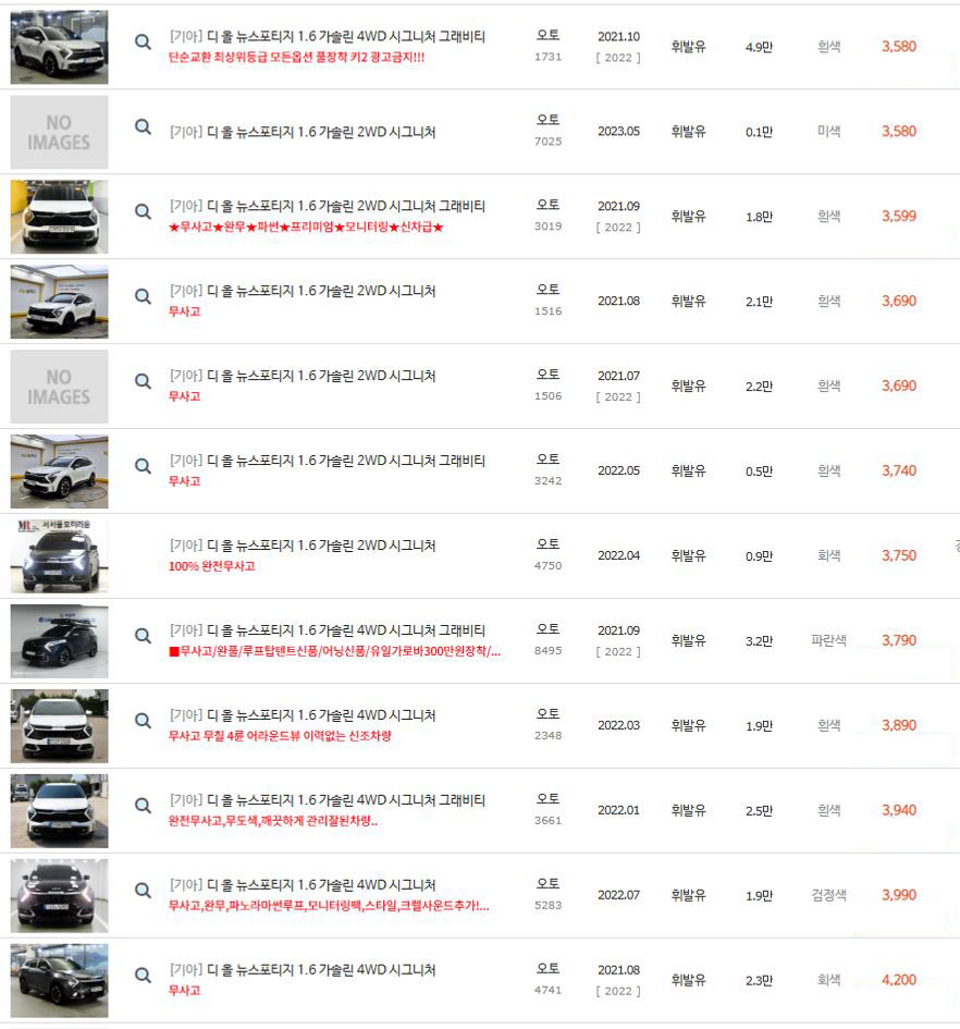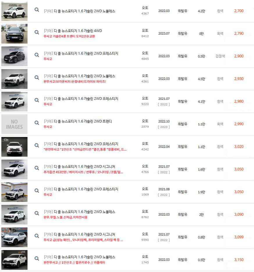 | 스포티지 1.6 가솔린 중고차 | 2,700 만원 ~ 4,000 만원 |