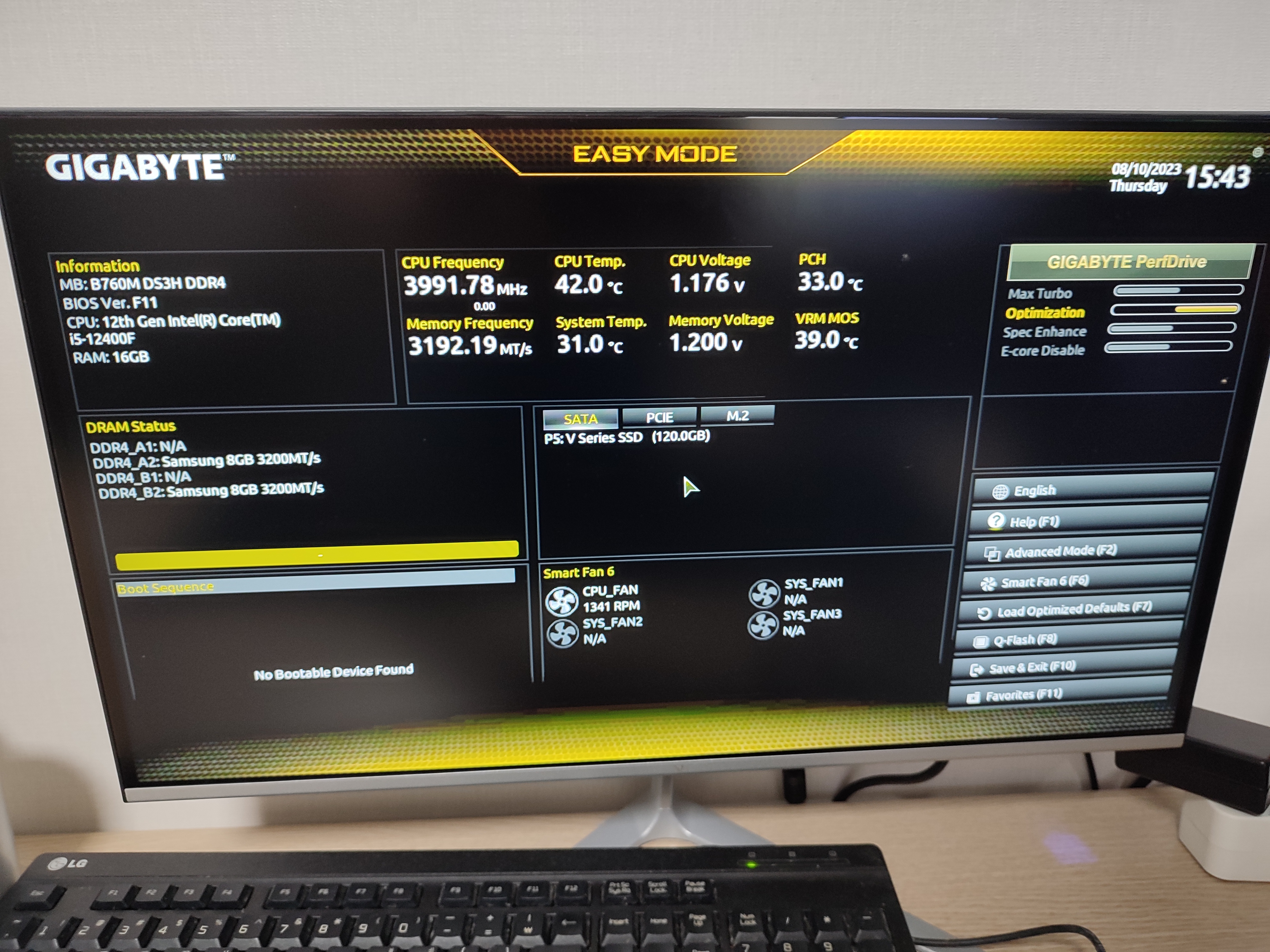 아직 윈도우나 리눅스인 OS를 설치전이라 바이오스 설정 화면으로 바로 넘어간 모습입니다.