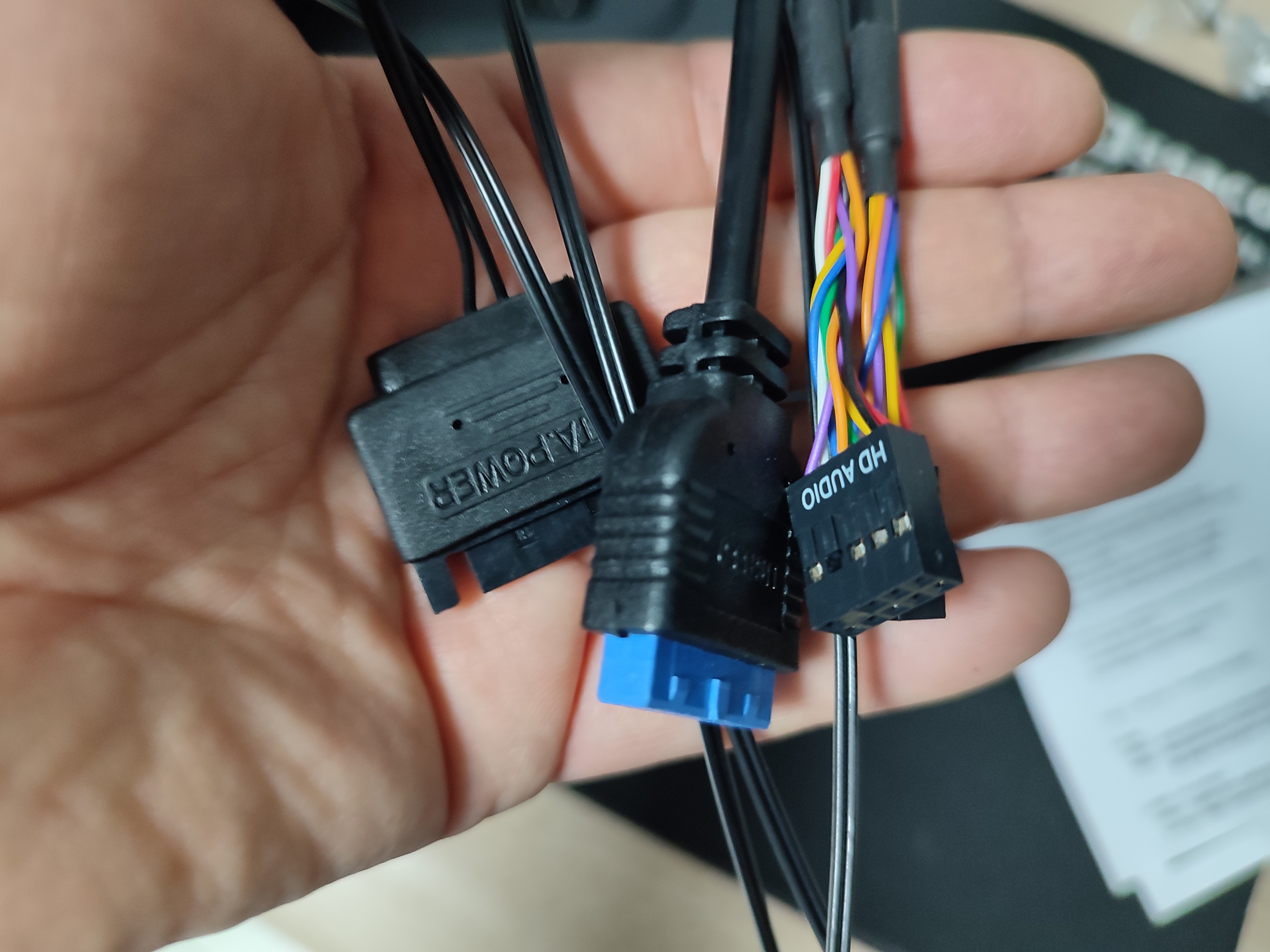 SATA POWER 와 USB선들, HD AUDIO 선들이 보이고 있습니다.