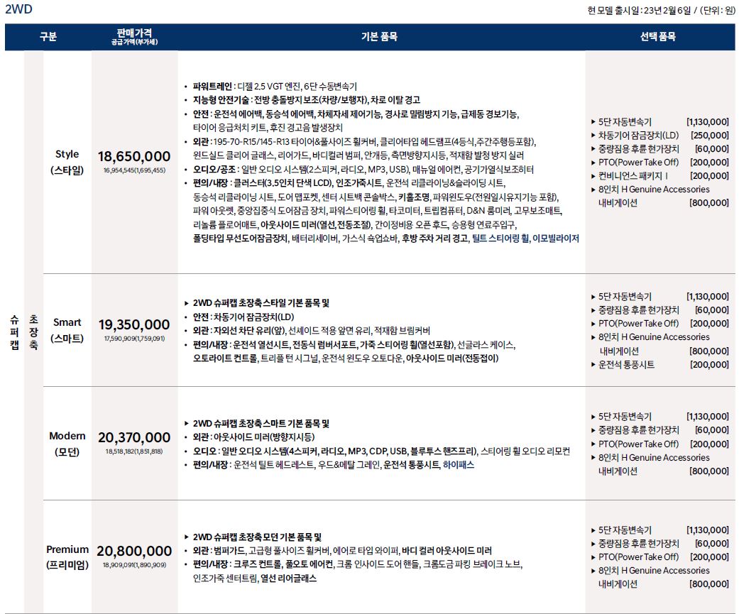 일반캡 초장축에는 스타일, 스마트, 모던, 프리미엄 트림이 있습니다.