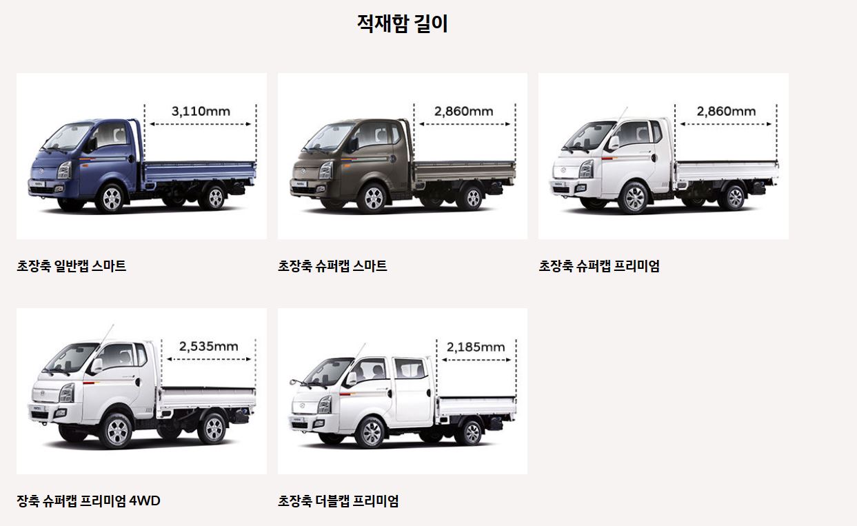 위에서 보셨듯이 적재함의 길이에 따라 포터 중고차에는 초장축과 장축이 있습니다.