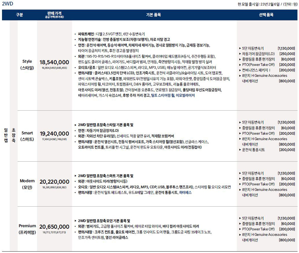 포터의 중고차시세를 알아보기 전에 현재 신차로 판매되고 있는 가격표부터 확인하도록 하겠습니다.