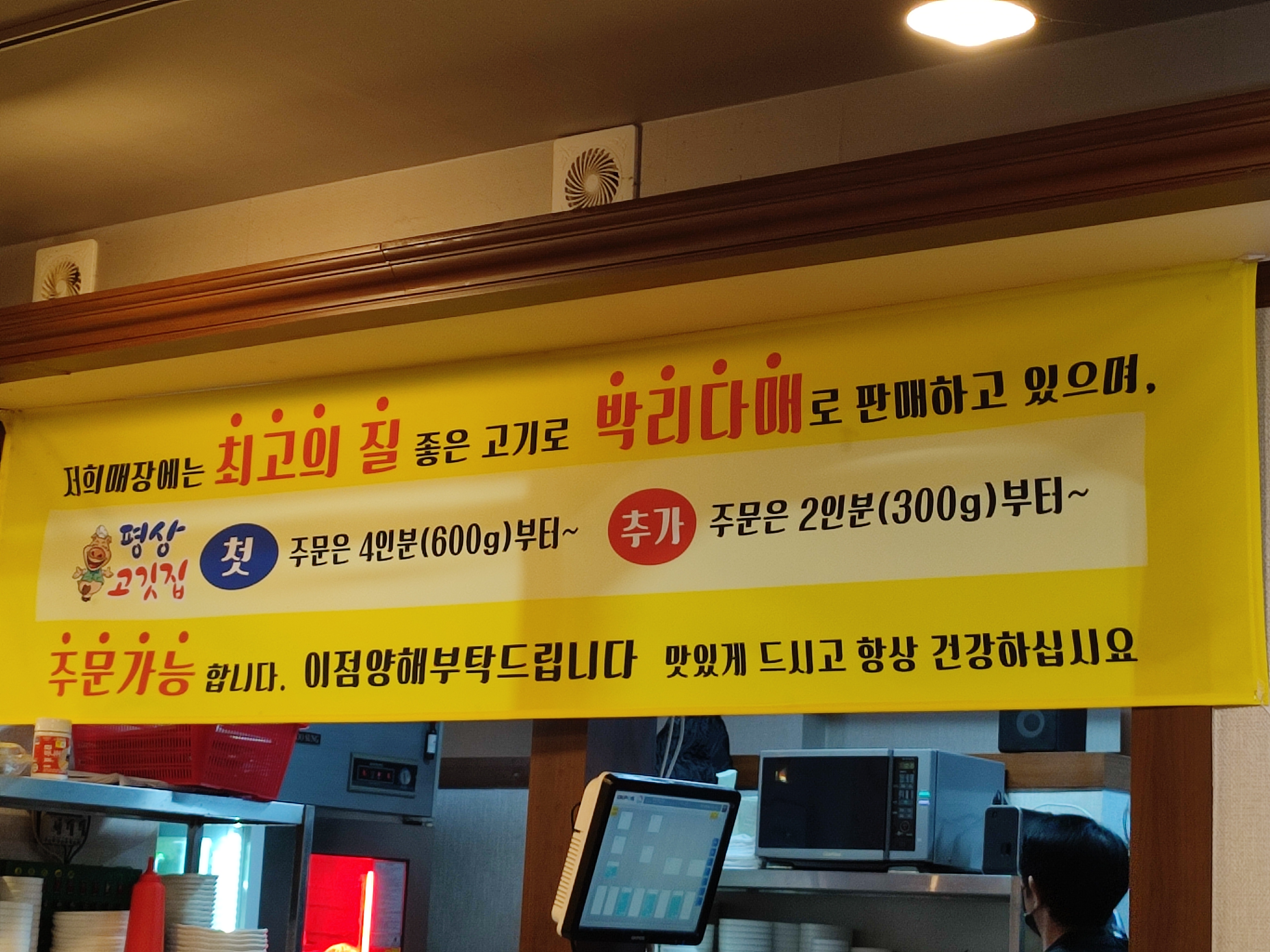 평상고깃집은 최고의 질 좋은 고기로 박리다매로 판매하고 있다는 내용이 있으며