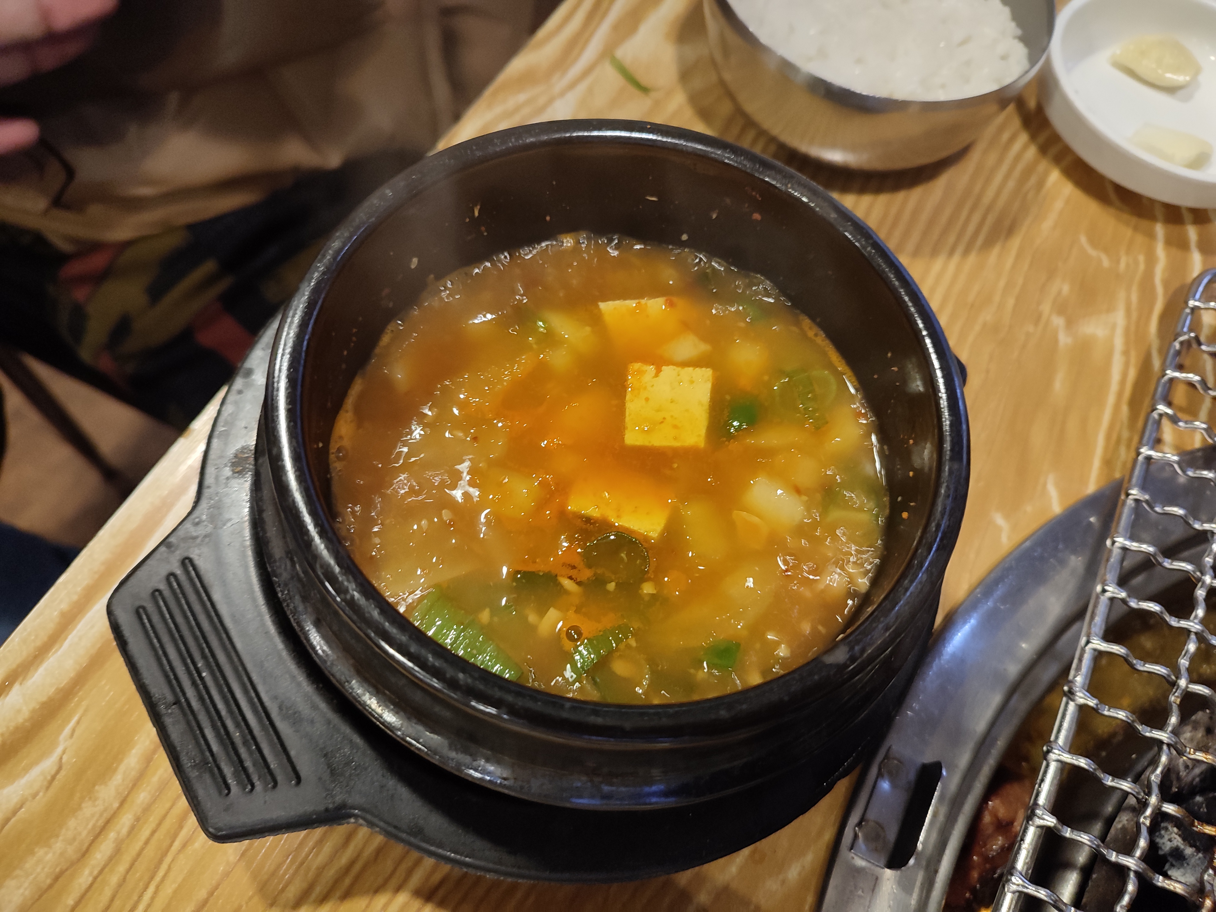 된장찌개가 짜지 않아 국물로 그냥 먹어도 되긴 하는데 뭔가 어색한 느낌...