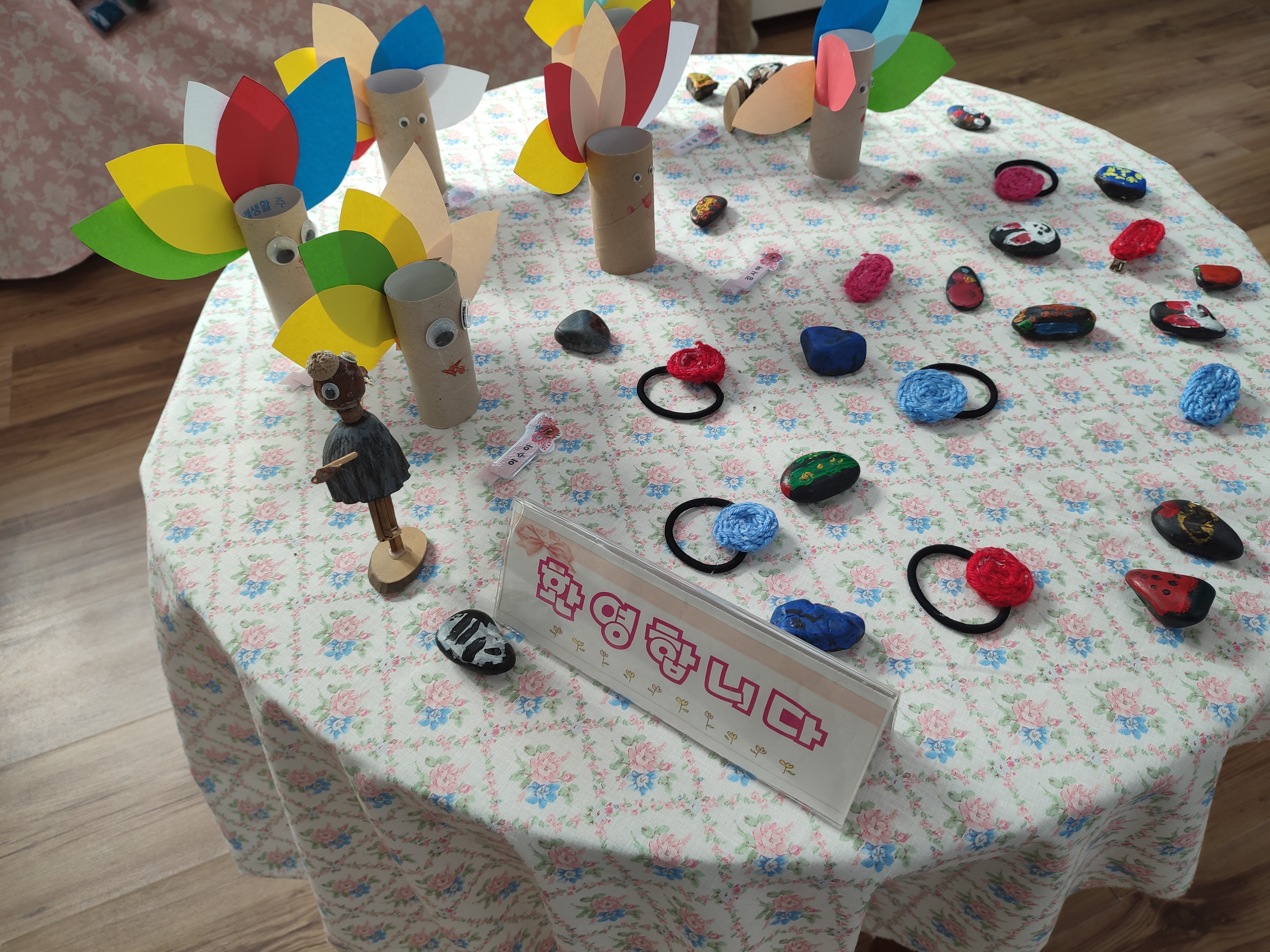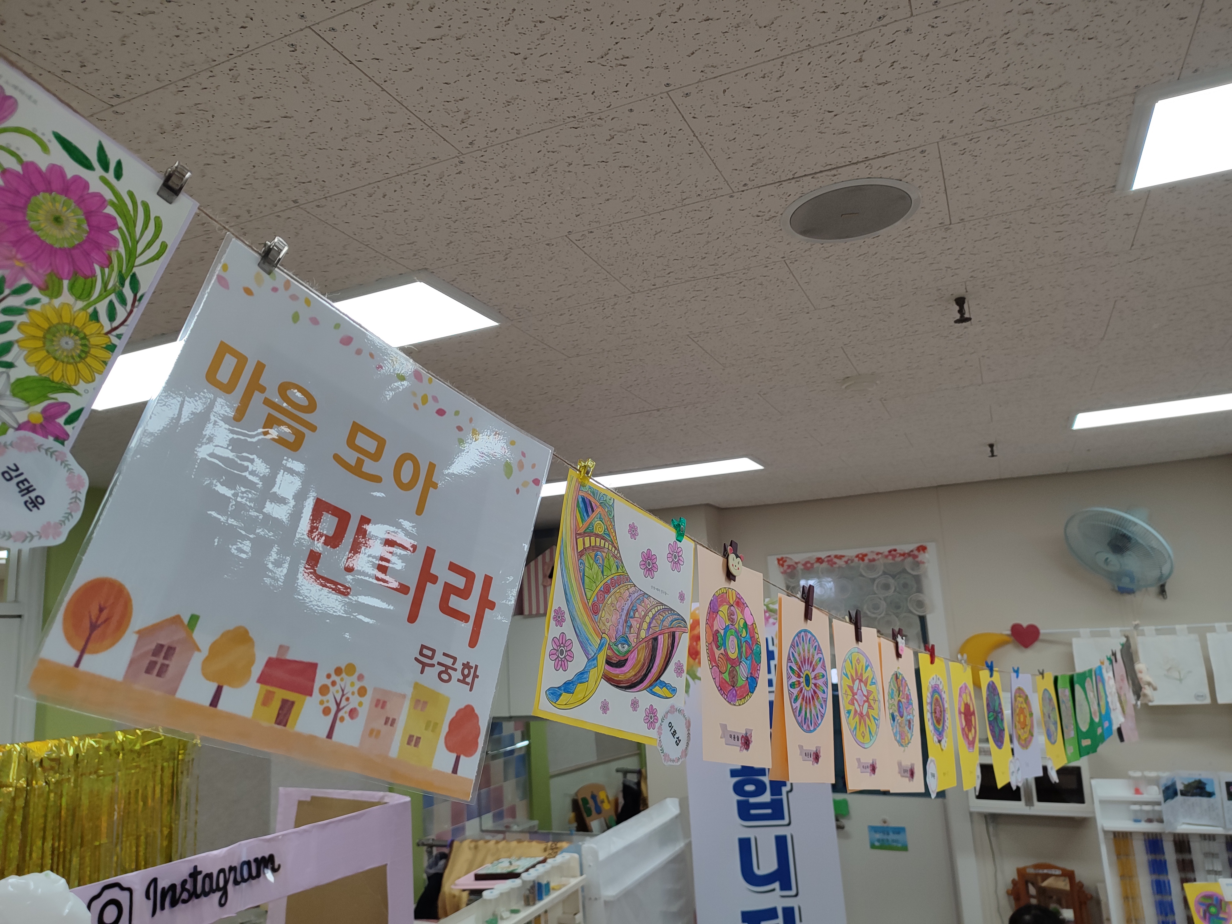 손끝놀이 전시회 매화반 교실에 들어가니 테이블위와 천장에 아이들의 작품들이 전시되어 있습니다.