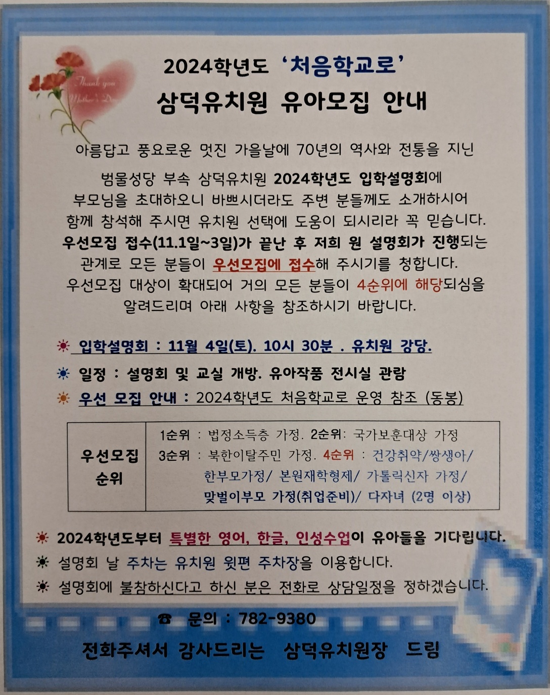 | 삼덕유치원 2024학년도 유아모집 홍보 안내 (0) | 2023.10.27 |