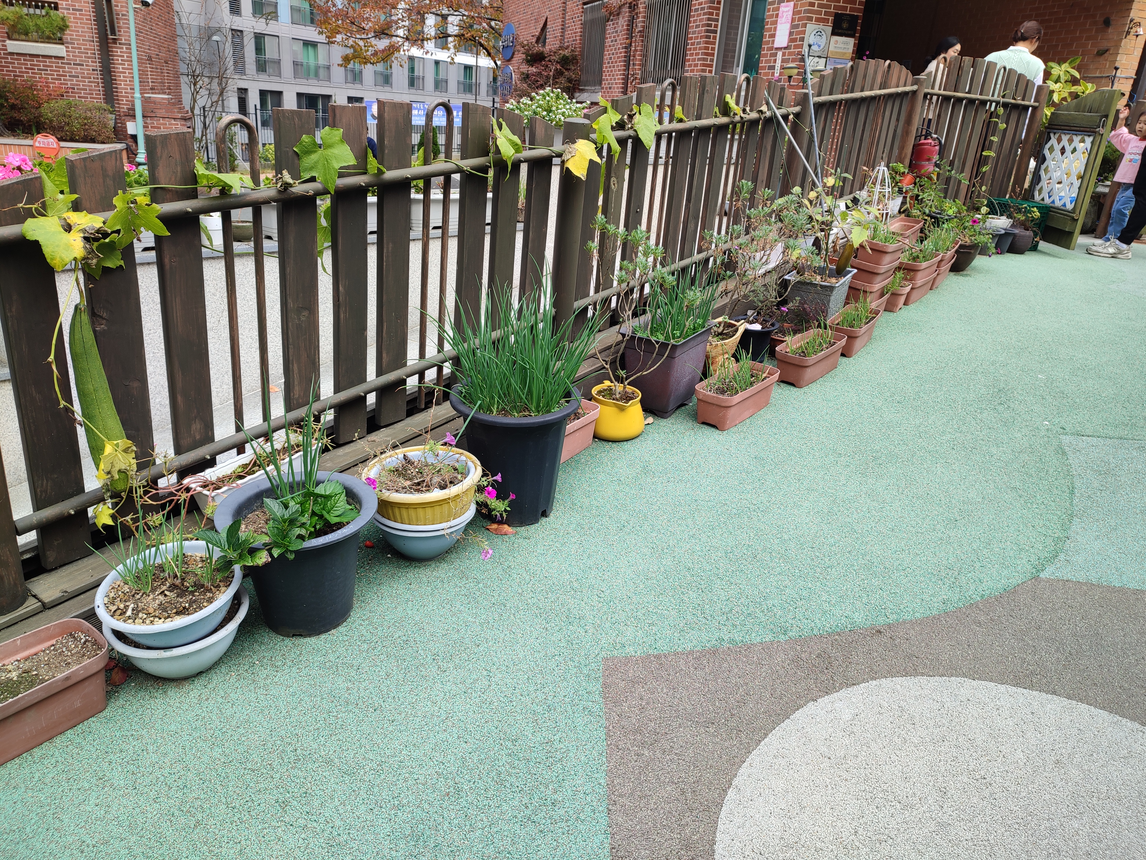 올라가는 계단과 유치원 계단에는 아이들이 심은 꽃과 식물들이 자라고 있습니다.