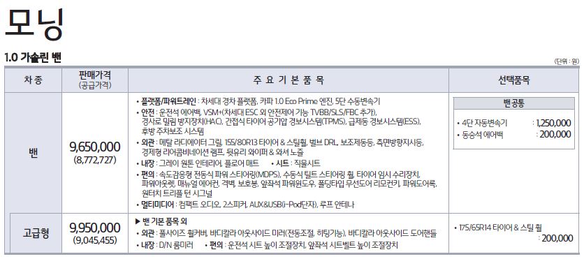 베이직 플러스를 보면 정말 깡통 모닝이라는 말이 어울릴 정도로 옵션이 미미 하네요.