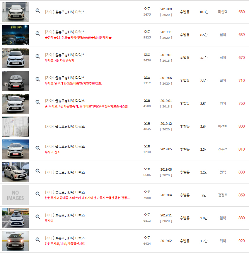 위에서 중고차매매사이트에서 판매되고 있는 2019년식 기아 모닝 중고차의 가격 시세표를 알아보았습니다.