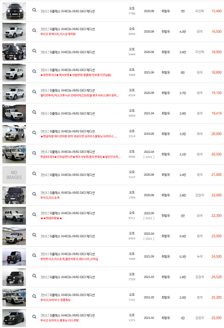 우리나라의 지바겐 중고차의 경우 대부분 가솔린 엔진의 차량이며 G63 AMG 가 주를 이루고 있다고 합니다.