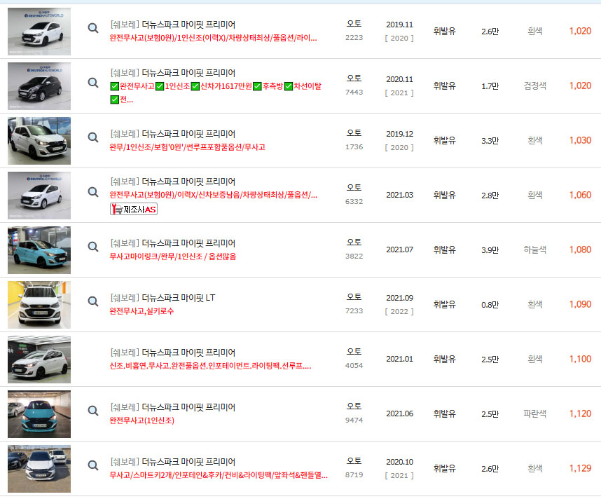 그럼 현재 중고차매매사이트에서 더뉴 스파크 중고차 중에서 1000만원대 중고차를 한번 살펴 보도록 하겠습니다.