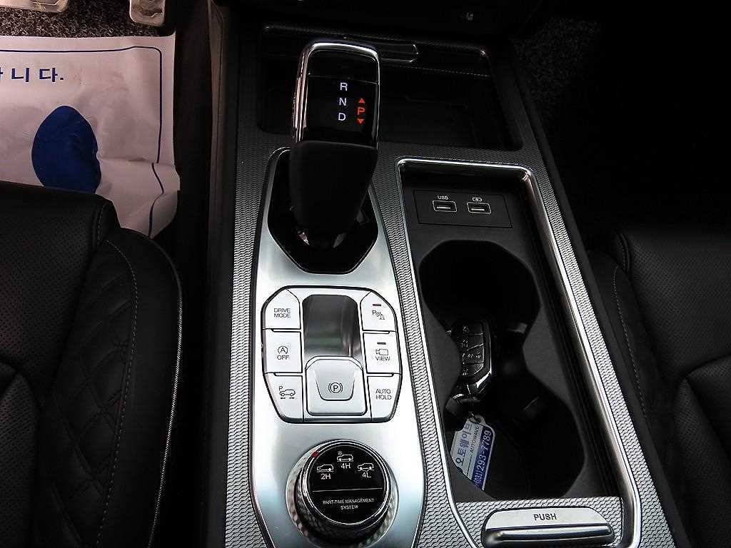 기어 변속은 전자식 변속기로 되어 있으며 옆에 컵 홀드가 앞뒤로 나란히 배열되어 있습니다.