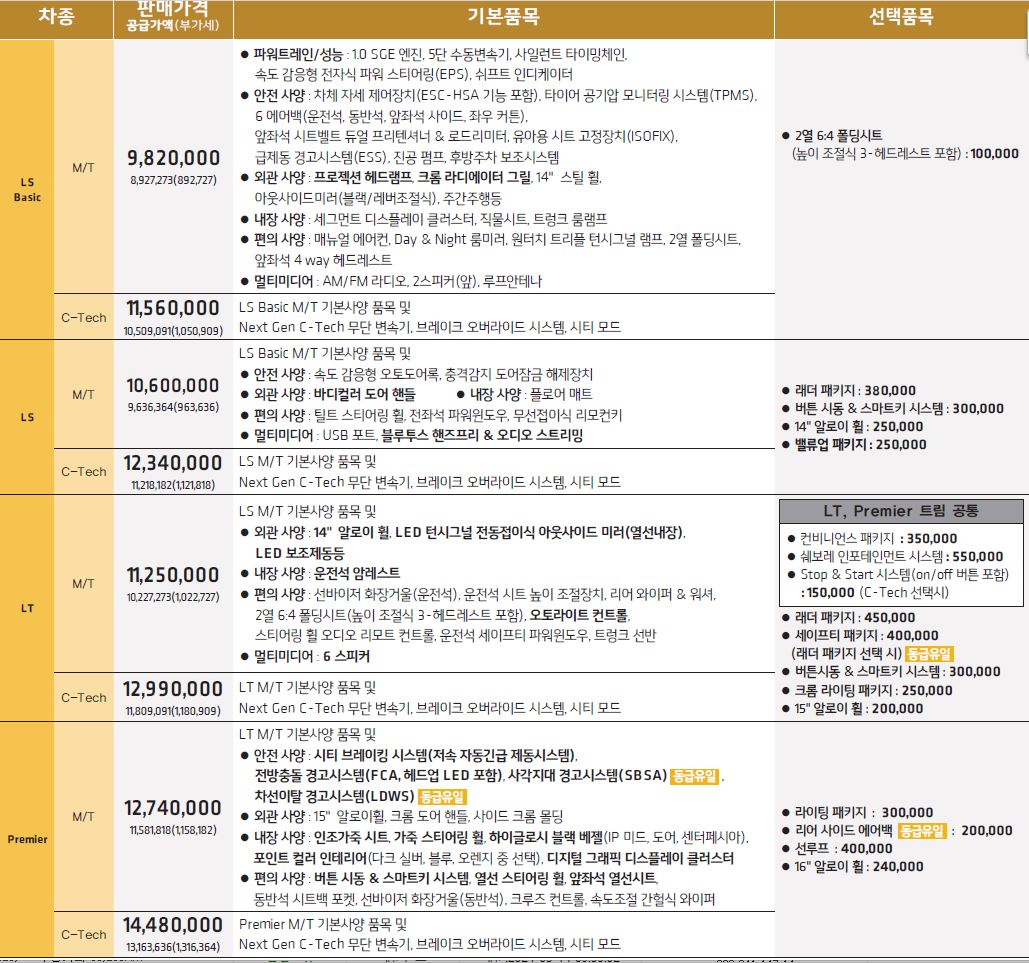 오토를 기준으로 보면 LS 베이직 1,156만원, LS 1,234만원, LT 1,299만원, Premier 1,448만원에 판매되었습니다.