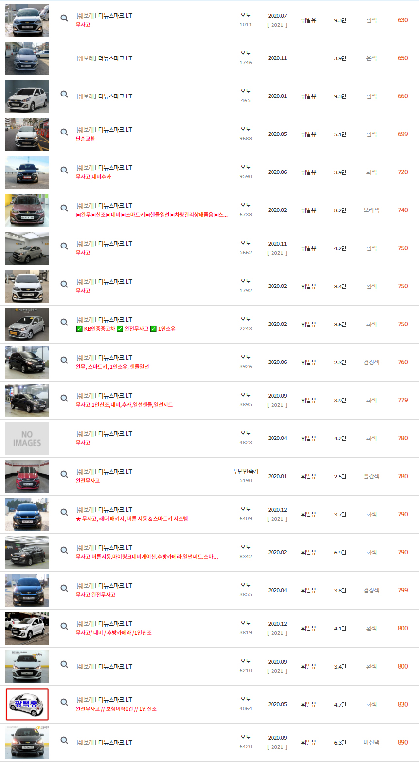 2020년식 스파크 LT 트림의 중고차 판매 리스트가 되겠습니다.